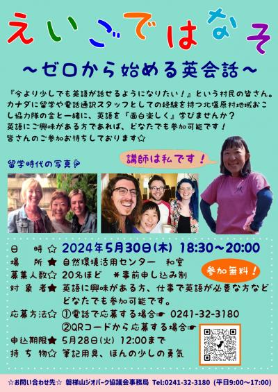 この度、村民向けの英会話教室を行うこととなりました。カナダでの留学経験を活かし、皆さんに『面白楽しく』英語を教えます!英語に興味のある方、仕事で英語が必要な方など、どなたでも参加できますので、皆さんのご応募お待ちしております!