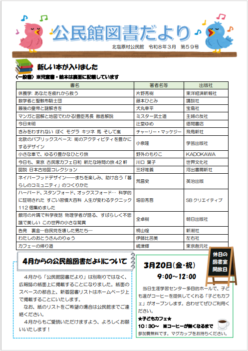 来年度から「公民館図書だより」は「広報きたしおばら」の中に掲載することになりました。